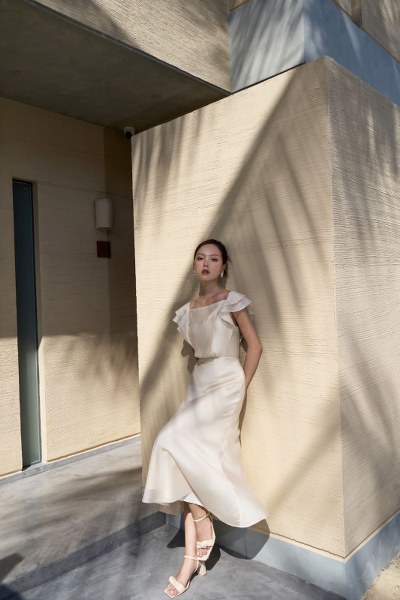 Đầm dáng xòe nhẹ cùng chiều dài midi, được thiết kế theo phong cách cổ điển, tinh tế nhưng vẫn đủ nổi bật qua các điểm nhấn xếp nếp phần chân cổ và thân trước. Kiểu dáng ôm eo nhẹ, bồng bềnh ở thân dưới giúp che đi những khuyết điểm cũng như tôn lên vóc dáng người mặc.