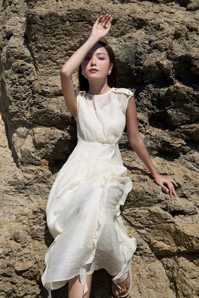 Thiết kế đầm cổ tròn, không tay, tùng váy dài xếp ly xòe chia tầng cách điệu. Đầm thiết kế thoải mái, đơn giản nhưng vẫn đáp ứng sự tươi trẻ, phóng khoáng cho mùa hè đến. Đây là sự hoàn hảo cho những ngày đi làm bận rộn, tan làm có thể trực tiếp diện đi cà phê, dạo phố với bạn bè.