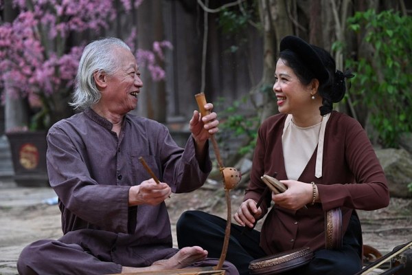 NSND Xuân Hoạch cùng Nghệ nhân Tạ Hạnh trong phần trình diễn nhạc cụ dân tộc
