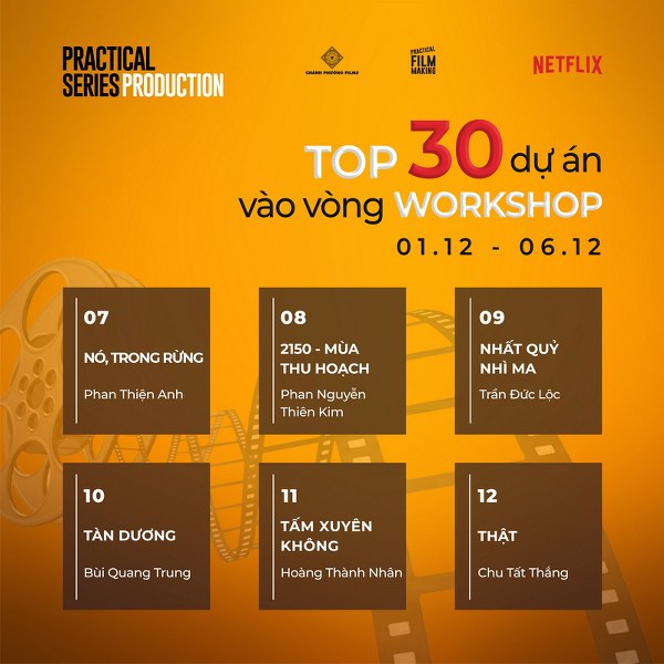 “Practical Series Production”, chương trình “đào tạo và hỗ trợ làm phim miễn phí” do Chánh Phương Films và Practical Filmmaking phối hợp thực hiện, quỹ Netflix Fund for Creative Equity tài trợ, vừa công bố top 30 dự án có ý tưởng thú vị nhất cũng như dàn khách mời lẫn giám khảo góp mặt ở vòng tiếp theo.